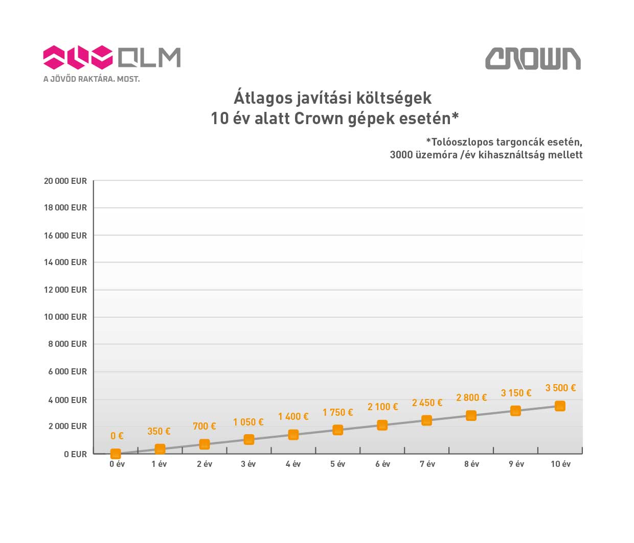 A kb. 3000 üzemóra/év üzemidejű tolóoszlopos targonca példáján végigvezetve jól látszik, hogy a Crown targoncák átlagos javítási javítási költségei nem emelkednek drasztikusan az 5.évtől kezdve. Ügyféltapasztalatok által is megerősítve minimálisan emelkedés tapasztalható évről évre, és a 10. év végén közelíti meg csak mindössze a 3500 eurós körüli értéket.
