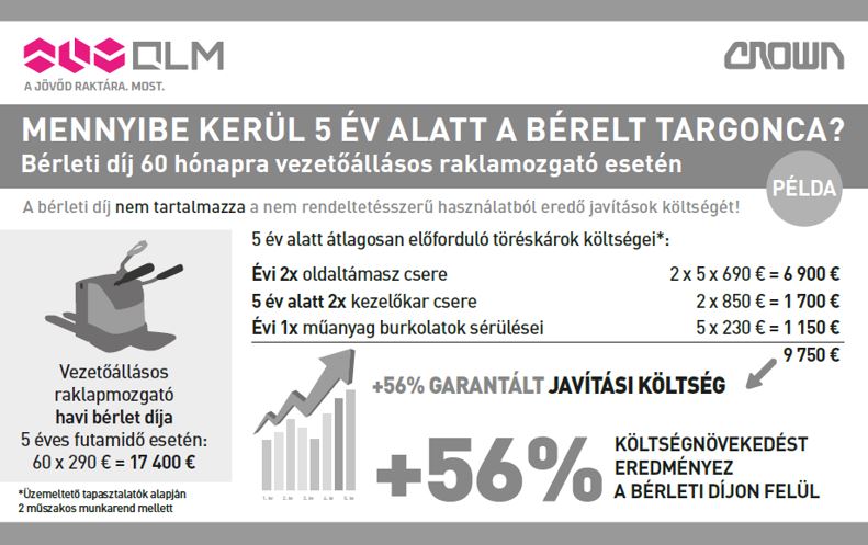 Bérletes konstrukció esetén a havidíj mellé – amely jellemzően tartalmaz biztosítást -úgynevezett teljes körű karbantartási (full service) szolgáltatás kapcsolódik. Ez a díj a rendeltetésszerű használatból eredő bármilyen meghibásodást lefedi az adott futamidő alatt, például évente egy, kopásból eredő kerékcserét. A napi működés során azonban a legnagyobb gondosság mellett is megsérül és cserére szorul egy-egy – jellemzően műanyag – alkatrész. A gyakorlati tapasztalatok alapján az életvédelmi funkciót ellátó oldaltámasz rendszeresen, évente legalább kétszer letörik ütközéskor vagy beakadáskor, amikor a targonca kigurul a kamionból. A kezelőkar ugyan ritkábban sérül, viszont a beépített elektronikának köszönhetően drágábban pótolható. A műanyag burkolatoknak pedig nem kell sok, elég egy véletlen koccanás, a kezelő beletérdel, és a villa ugyan ép marad, de a burkolatot bizony cserélni kellene.