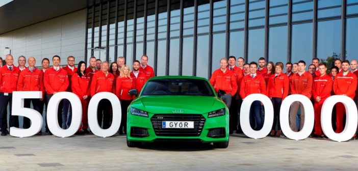 Győr, 2017. október 2. – Az Audi Hungaria járműgyártása fontos mérföldkőhöz érkezett: elkészült az 500 000. autó, egy Audi TT S Győrben és indult Nagy-Britannia felé, új tulajdonosához. Az autó „viperazöld” színű egyedi lakkozást kapott és egy 2,0 literes négyhengeres benzinmotor hajtja, amely szintén az Audi Hungariánál készült.