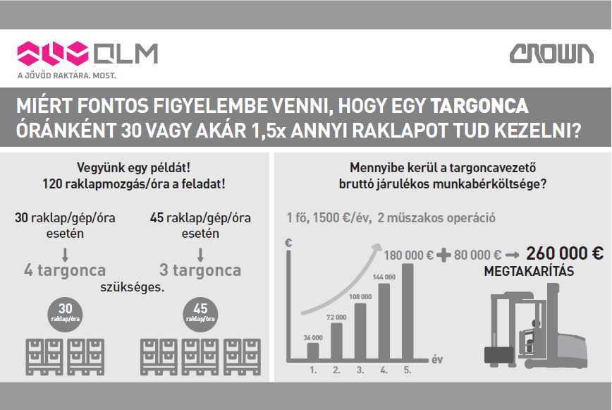 1 Crown targonca felér 2 másikkal – hirdetik a világmárkáról (https://qlm.hu/1crownfeler2masikkal/ ) de a szavak mögött ezúttal jól körülhatárolható és összehasonlítható számokat is találunk. A TSP (keskenyfolyosós) targoncával például biztosan megtakaríthatunk: kiemelkedő hatékonyságának köszönhetően 3 gép vásárlása, bérlete esetén 5 év alatt még 3 gép árát meg lehet spórolni! Az Crown tolóoszlopos és a gyalogkíséretű géptípusok esetében az egyedülálló ergonómia mellett a kivételes sebesség és gyorsulási értékek csökkentik a ciklusidőt, ezáltal egyedülállóvá teszik a gépek termelékenységét.